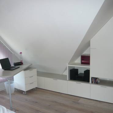 Aménagement chambre sur mesure sous rampant avec bibliothèque et bureau pivotant