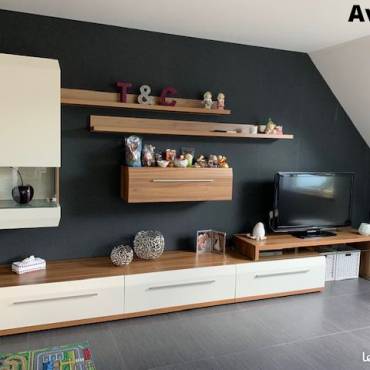Rénovation d’un espace salon qui auparavant comportait un mur noir, des meubles en bois, un important manque de rangement