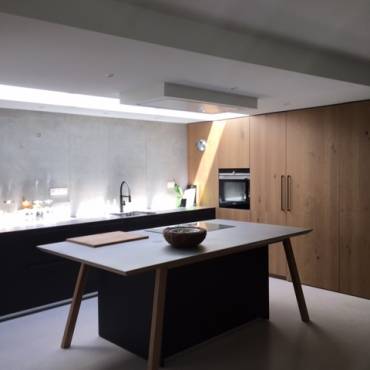 Originalité et sobriété où l’on retrouve des matériaux bruts tels que la crédence en béton, le plan de travail en inox massif, les colonnes en chêne à noeud associés au fénix noir.