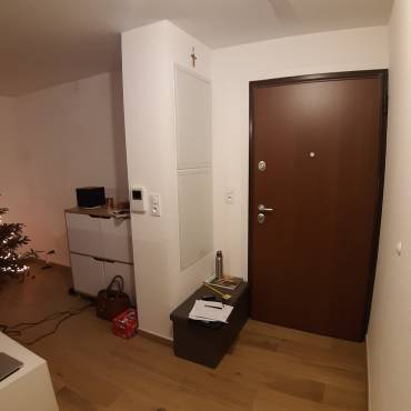 Meuble d’entrée-rangement chaussures, bibliothèque TV, et bureau sur mesure, double face, Novamobili, répondant à la nécessité d’une triple fonction dans un même espace en créant une séparation sans occulter la lumière, laqué blanc et gris mat