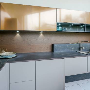 façade fenix sans poignée, ouverture électrique, crédence plaquage chêne thermotraité, plan de travail deqton kelia, meuble haut laqué métal cuivre, plaque de cuisson W-Zug Fulflex.