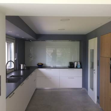 Cuisine sur mesure laquée blanc mat et chêne à nœuds crédence en verre laqué